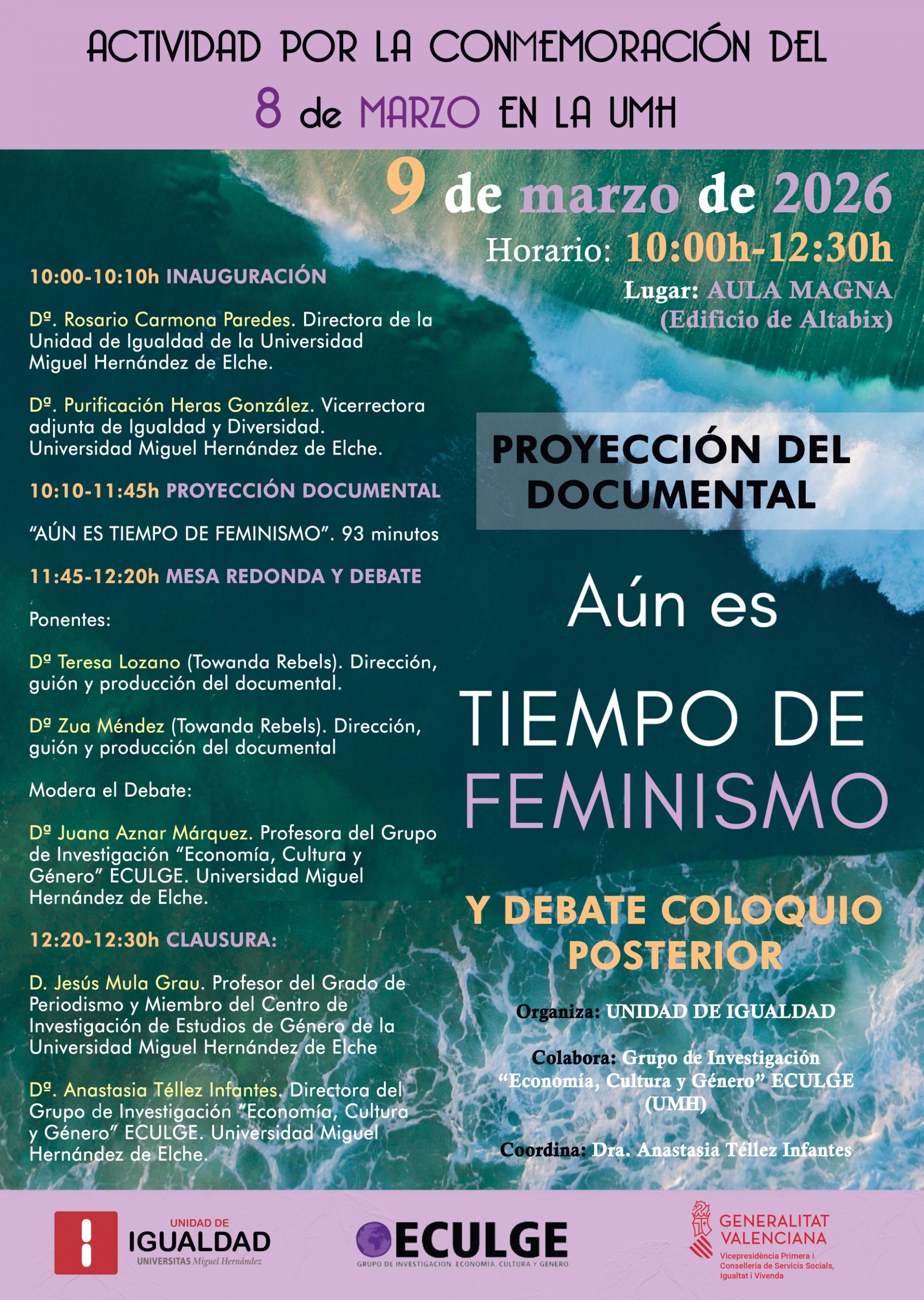 Elche, 2026 – La Universidad Miguel Hernández (UMH) se suma una vez más a las celebraciones por el Día Internacional de la Mujer con una jornada dedicada a la reflexión y el análisis feminista. El próximo lunes 9 de marzo de 2026, el Aula Magna del edificio Altabix (campus de Elche) acogerá el evento «Aún es tiempo de feminismo», organizado por la Unidad de Igualdad de la institución. El acto es de entrada libre limitado al aforo.